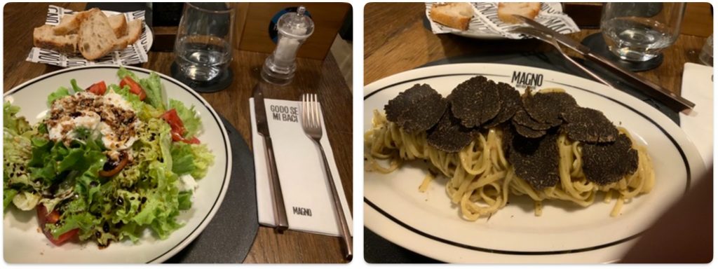 Im Hotel strecke ich mich kurz aus und schreibe den Anfang dieses Tagebuchs. Da für den Abend Regen angesagt ist, gehe ich gegen 18:30 Uhr essen: einen Salat mit Büffelmozzarella und Walnüssen und – in der Hauptstadt des Piemont selbstverständlich – Pasta mit schwarzem Trüffel. Dass ich erst nach einigem Suchen ein Restaurant finde, das Tartufo auf der Karte hat, überrascht mich. Diese Pasta haben es verdient als Foto verewigt zu werden.