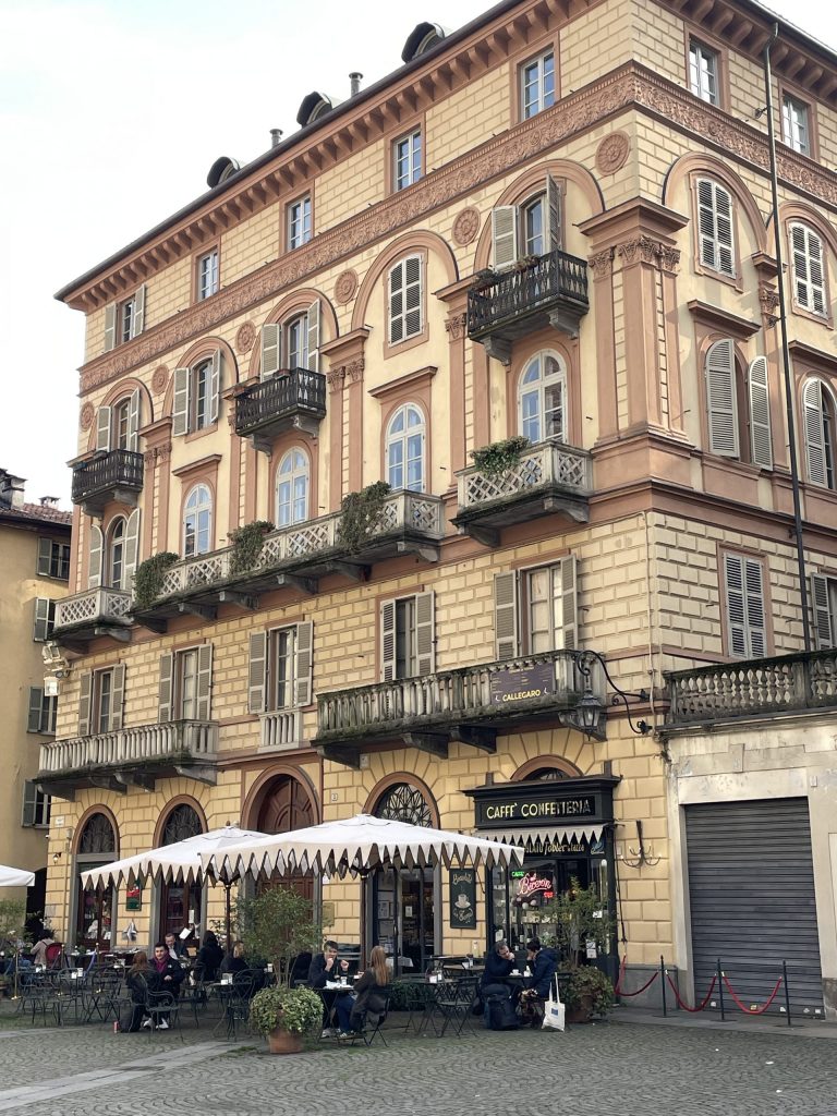 Die barocke Fülle des Santuario della Consolata wirkte heute besonders intensiv, mit ihren Ex‑Votos und dem gedämpften Licht. Gegenüber das berühmte Caffè Al Bicerin, das ich diesmal nur von außen betrachtete. Die Contrada dei Guardinfanti zeigte sich schmal und farbig, mit ihren Bannern und Boutiquen, bevor ich über die Via Garibaldi weiterging – die alte römische Hauptachse, heute eine lebendige Fußgängerzone.