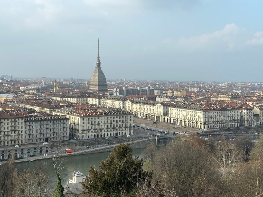 Schließlich erreichte ich die Piazza Castello, den weiten, offenen Platz, der wie ein riesiger Paradeplatz wirkt. Von dort überquerte ich den Po und begann den Aufstieg zum Monte dei Cappuccini. Der Weg war steiler, als ich es mir gewünscht hätte – nach meinem schottischen Bergabenteuer wollte ich solche Steigungen eigentlich vermeiden. Aber oben wartete die Belohnung: ein weiter Blick über die Stadt, die heute im milden Licht fast weich wirkte. Cappuccino gab es dort oben allerdings keinen.