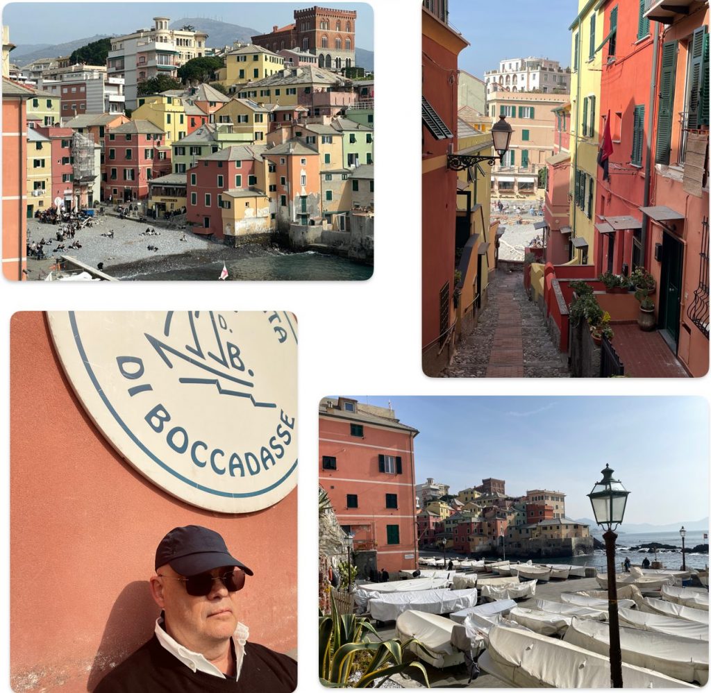 Bisher zahlte ich alles mit der Kreditkarte, die auf dem Handy gespeichert ist. Nur das Busticket für den 42er musste ich bar bezahlen – wie früher – und in einem Tabacchi kaufen. Von der Piazza Ferrari fahre ich ungefähr 20 Minuten lang zum „Blankenese“ von Genua, das Boccadasse heißt. Die Szenerie ist so kitschig wie pittoresk. Boccadasse ist einer dieser Orte, an denen die Zeit stehen geblieben zu sein scheint: ein paar bunte Häuser, ein kleiner Strand, das Klirren der Boote, der Duft von Focaccia und Meer.