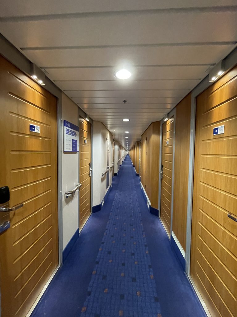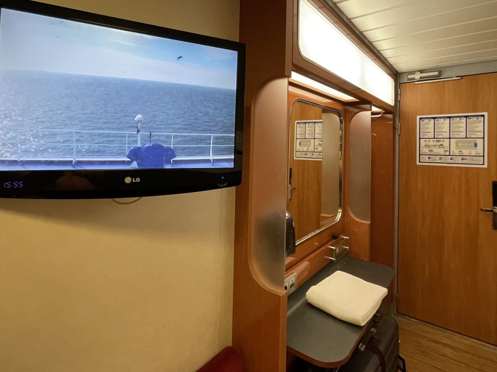 Auf dem Schiff gilt britische Zeit – wir bekommen eine Stunde geschenkt! Damit wird die jedem Seemann heilige Mittagsstunde um eine Stunde länger, und ich kann zwei Stunden im Bett verbringen. Für die achtstündige Überfahrt habe ich eine Kabine ohne Fenster für weniger als 40€ gebucht. Sie ist erstaunlich groß und verfügt sogar über eine eigene Dusche. Der absolute Hit: der Fernseher, der auf einem Kanal Livebilder der Kamera überträgt, die am Bug steht. Ein Segen für Menschen mit Platzangst – das Meer im Fernseher statt vier Wände anzustarren.