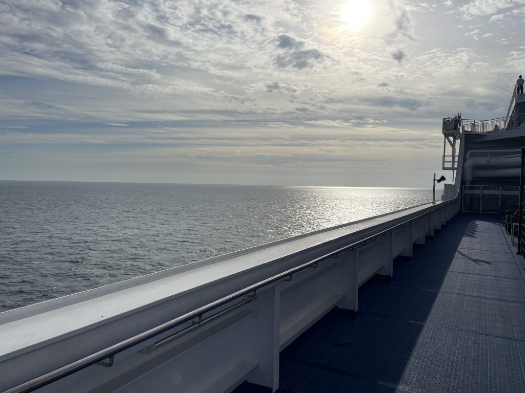 Um 10:00 Uhr muss ich auschecken, darf aber noch bis 12:00 Uhr sitzenbleiben und den ersten Tagesbericht zu Ende schreiben. Nach einem 10-minütigen Spaziergang zum Fähranleger zeigt sich die Stena Britannica in ihrer ganzen Pracht: Sie hat bereits begonnen, die circa 230 Autos und LKW zu schlucken wie ein mechanischer Wal. Bis zu 1200 Passagiere können in 550 Kabinen untergebracht werden. Der längste Korridor misst 220 Meter, das Schiff hat zwölf Etagen. Natürlich gibt es auch jede Menge Einkaufsmöglichkeiten, diverse Bars und Restaurants – plus plärrende Kinder und nervige, laute Musik.