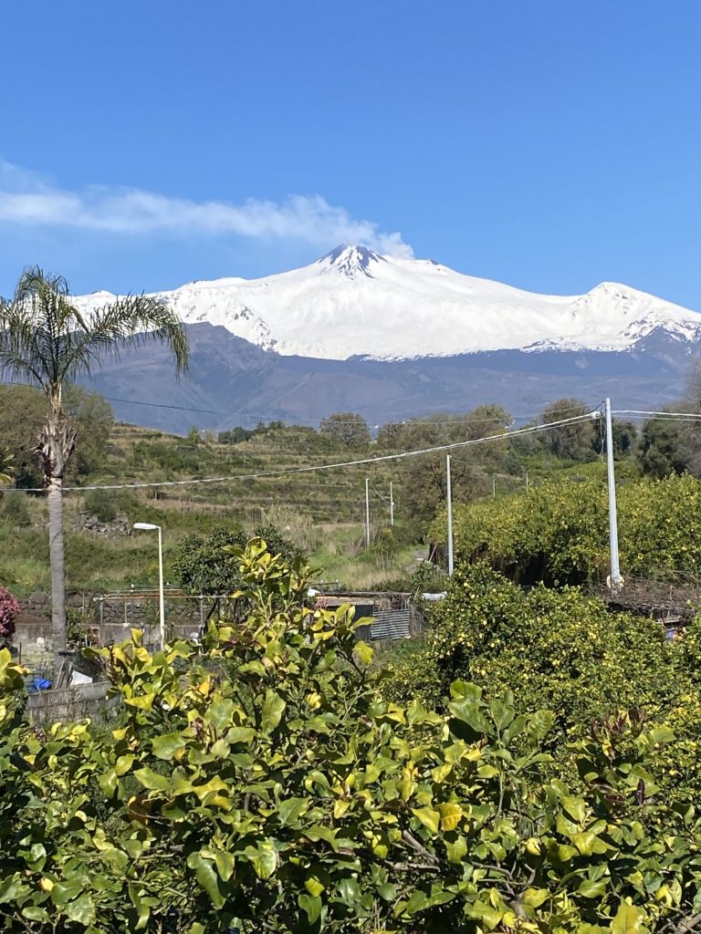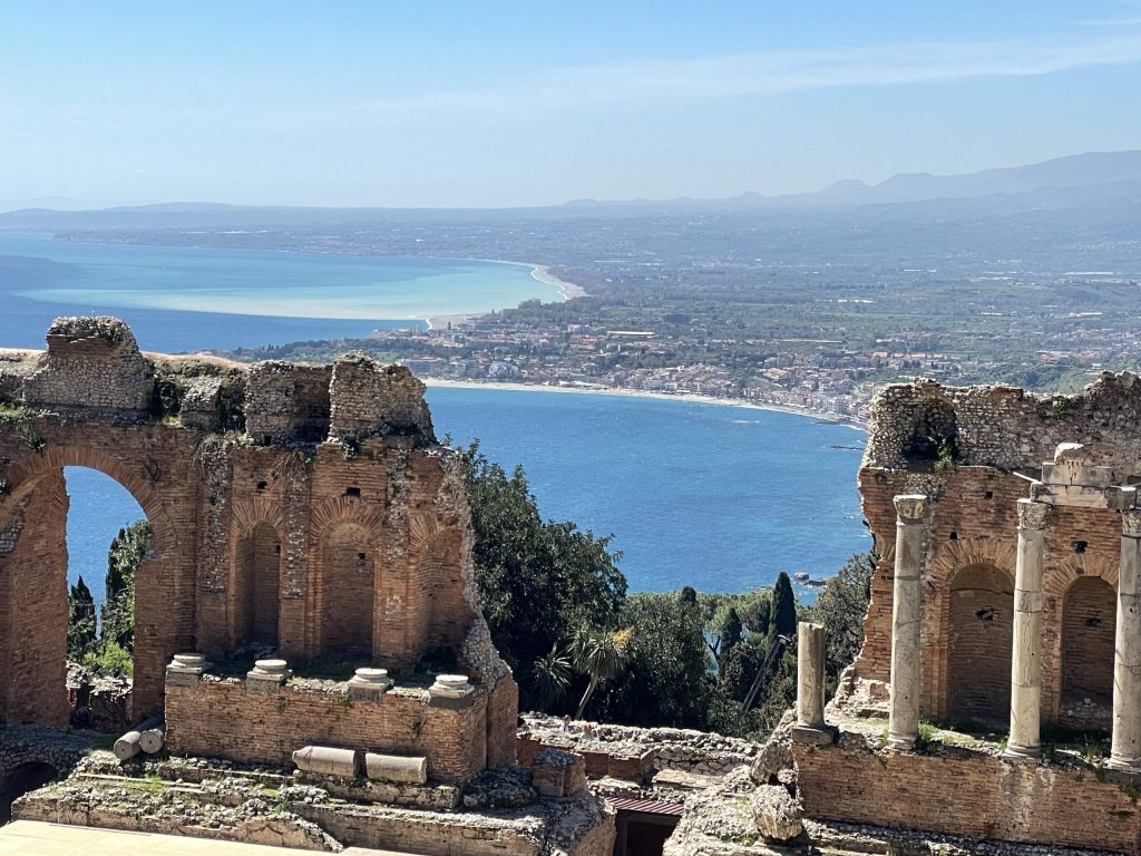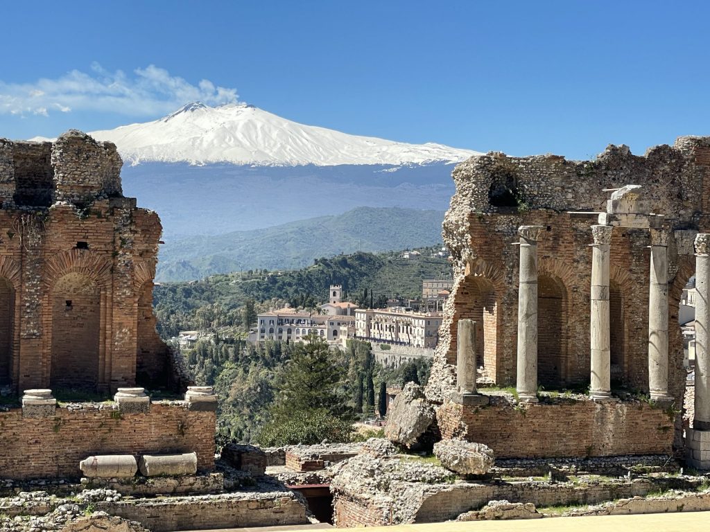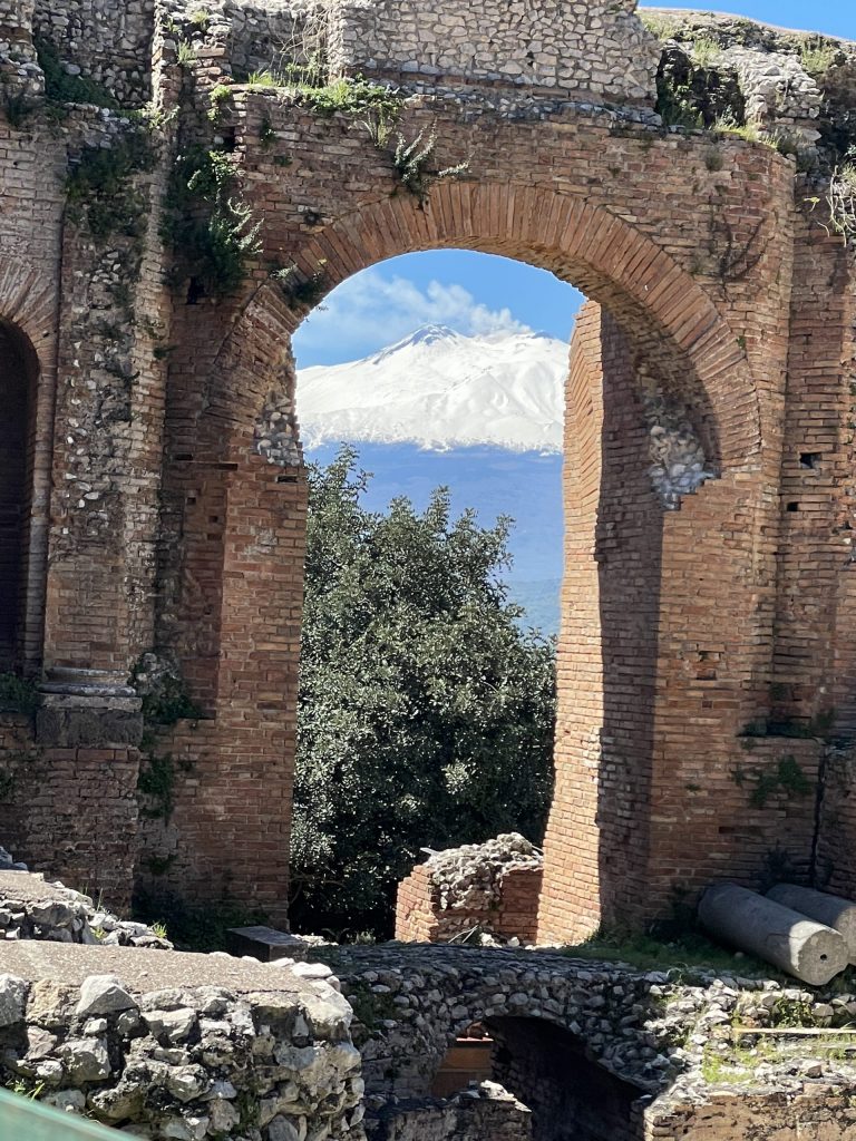 Im 3. Jahrhundert v. Chr. bauten die Griechen das Theater, die Römer erweiterten es später. Der Ätna ist Teil der Bühne und der Inszenierung, genauso wie der Blick zum Horizont des Ionischen Meeres. Wenn man das Theater betritt, ist man zunächst überrascht, wie groß es ist, überwältigt von diesem einmaligen Ausblick auf Kultur und Natur und dann fasziniert von dem Gedanken, dass genau auf diesem Sitz, auf dem ich saß, schon vor 2.300 Jahren Menschen saßen und sich an der Ästhetik erfreuten. Aus einem der höchsten Krater entließ L’Etna ein weißes Band von Rauch in den blauen Himmel. Die weißen Schneefelder strahlten; an manchen Stellen glänzten und funkelten sie im hellen Sonnenlicht.