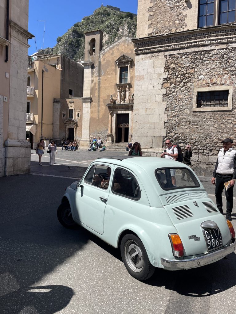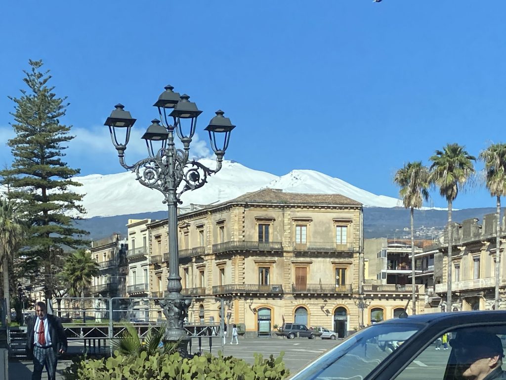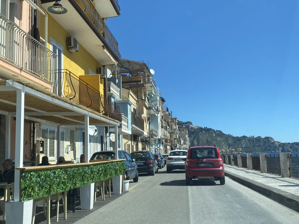 Der wolkenlose Himmel versprach klare Sicht auf L’Etna. Die Fahrt nach Taormina war herrlich. Durch die offenen Autofenster wehte ein warmer Wind, und aus den Lautsprechern des Wagens klang Musik von Josh Turner, die man in dieser Umgebung wunderbar hören kann. Ansonsten höre ich Vivaldi und Albinoni.