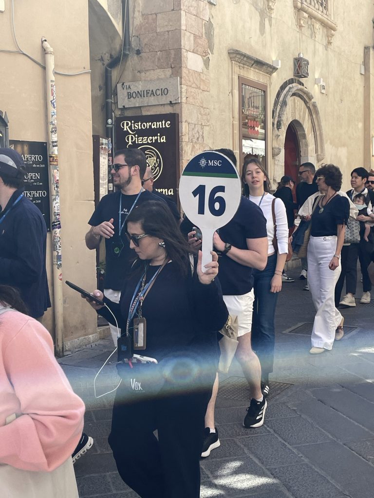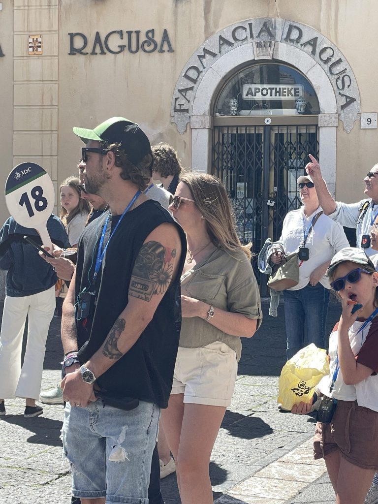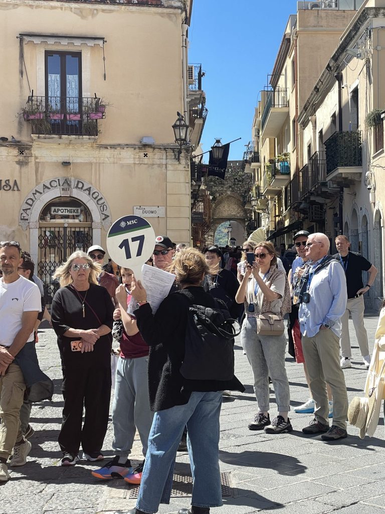 Mit der Ruhe hatte es ein jähes Ende, als ich mich auf den Rückweg zum Parkhaus machte. Ich musste mich durch achtzehn Gruppen von Kreuzfahrern drängeln, die sich wie eine fette, menschliche Raupe Nimmersatt durch die enge Hauptstraße schoben, angeführt von Reiseführern, die in drei Sprachen ihre Gruppen anfeuerten, schneller zu gehen, Fotos zu machen, kein Eis zu kaufen, weil man es sonst nicht zum Teatro schaffen und damit das Programm nicht einhalten würde. Belustigt und entsetzt habe ich mir diese Prozession angesehen, die dabei vorgab, italienische Kultur und Italien kennenzulernen.