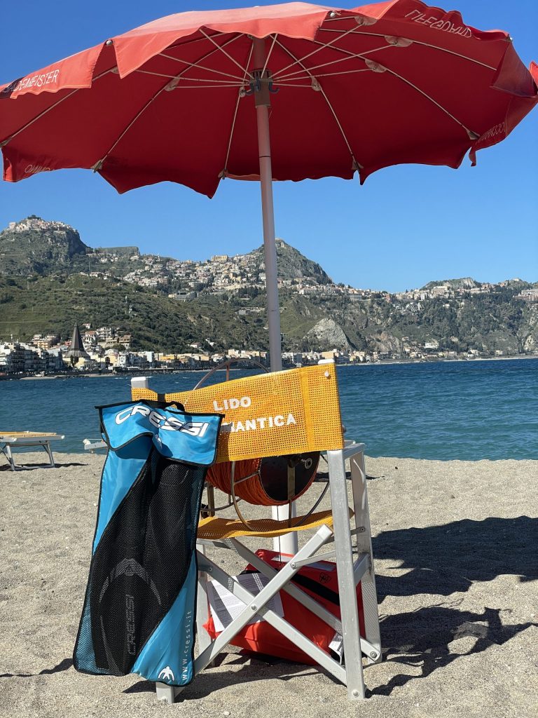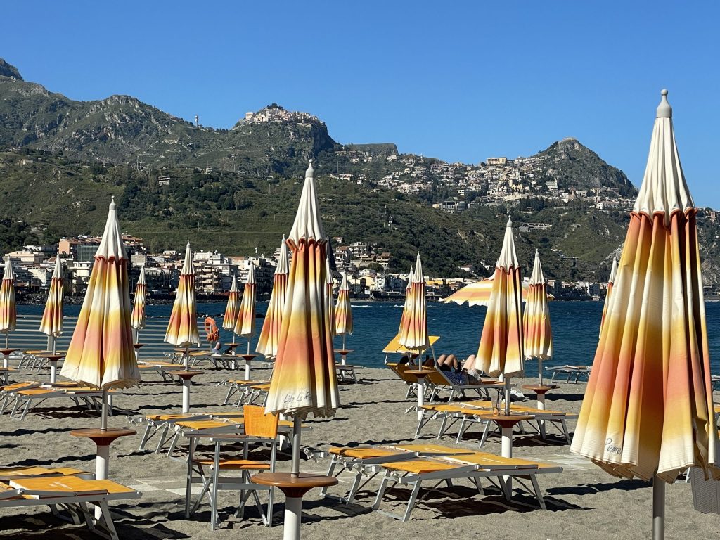 Am Strand von Giardini Naxos waren die Reparaturarbeiten an den verschiedenen Lidos gut vorangekommen. An einem sonnten sich schon die ersten Gäste auf den Liegen und genossen die Ruhe und den Blick auf Taormina.