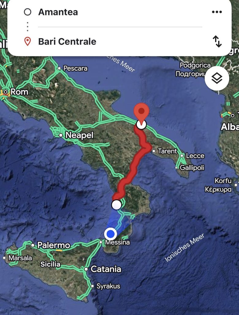 Um 9:00 Uhr schloss ich die Tür der Unterkunft hinter mir und ging über den Parkplatz zur Fähre nach Villa San Giovanni. Von der Anlegestelle dort bis zum Bahnhof sind es kaum mehr als einen Kilometer, in fünfzehn Minuten bequem zu schaffen. Der erste Zug brachte mich in eineinhalb Stunden nach Amantea, wo ich einen kurzen Aufenthalt hatte, bevor ich weitere vier Stunden in der sehr bequemen Ersten Klasse verbrachte und um 16:13 Bari erreichte. Zweimal musste der Zug jeweils zehn Minuten warten, um am Ende pünktlich in Bari anzukommen! So etwas habe ich bisher nur selten erlebt.