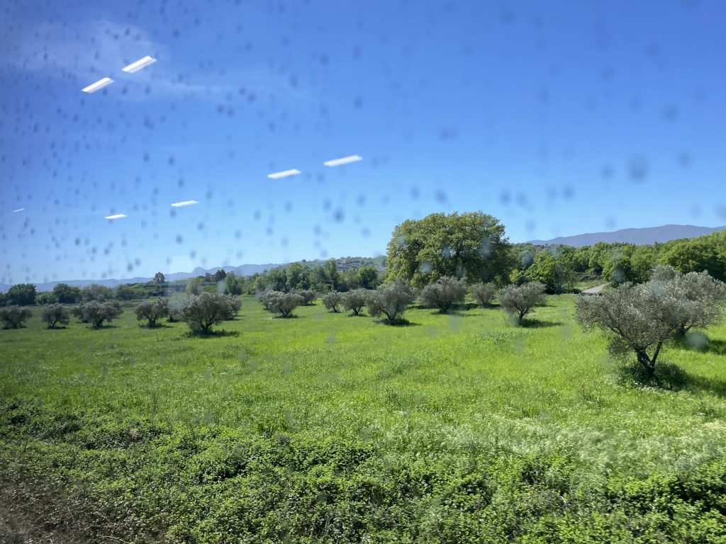 Auf der Strecke von Villa San Giovanni nach Bari sauste der Zug mit 150 km/h zunächst dicht an der Küste entlang, wo helle Strände und das flache, fast metallisch schimmernde Tyrrhenische Meer vorbeizogen. Weiter im Landesinneren breiteten sich endlose Plantagen aus – Zitrusfrüchte, Mandarinen, Olivenhaine, später Feigenkakteen und Weinreben, die wie Muster über die Hügel gelegt sind. Dazwischen leuchteten jetzt im April die weiß blühenden Mandel- und Kirschbäume. In der Ferne erhoben sich die schneebedeckten Gipfel des Aspromonte und später des Pollino-Massivs, ein kühler Kontrast zur warmen südlichen Landschaft.