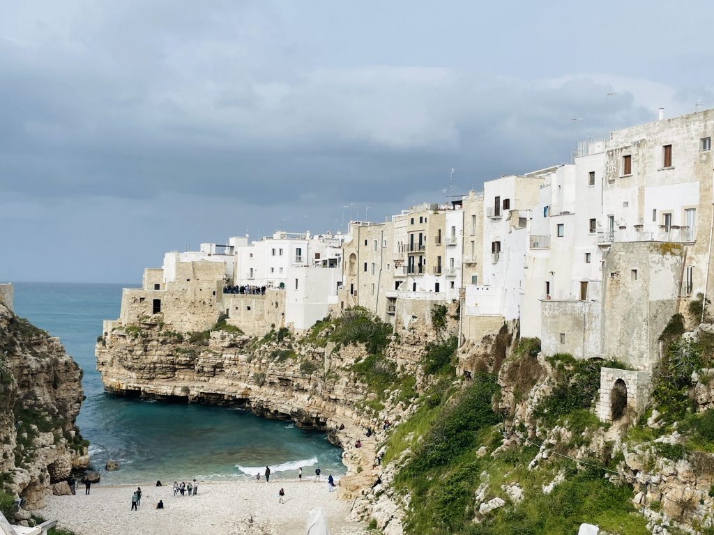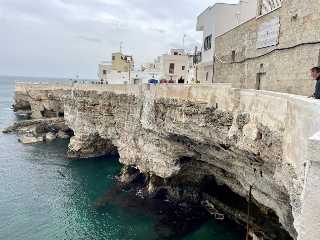 Polignano a Mare sah ich schon von weitem auf den Kreidefelsen liegen. Es blies den ganzen Tag lang ein starker auflandiger Wind aus Südost, der hier Yugo oder Scirocco genannt wird. Über den Himmel stürmten dunkle Wolken, so dass das Wasser nicht wie in den Prospekten türkisblau strahlte, sondern grau.