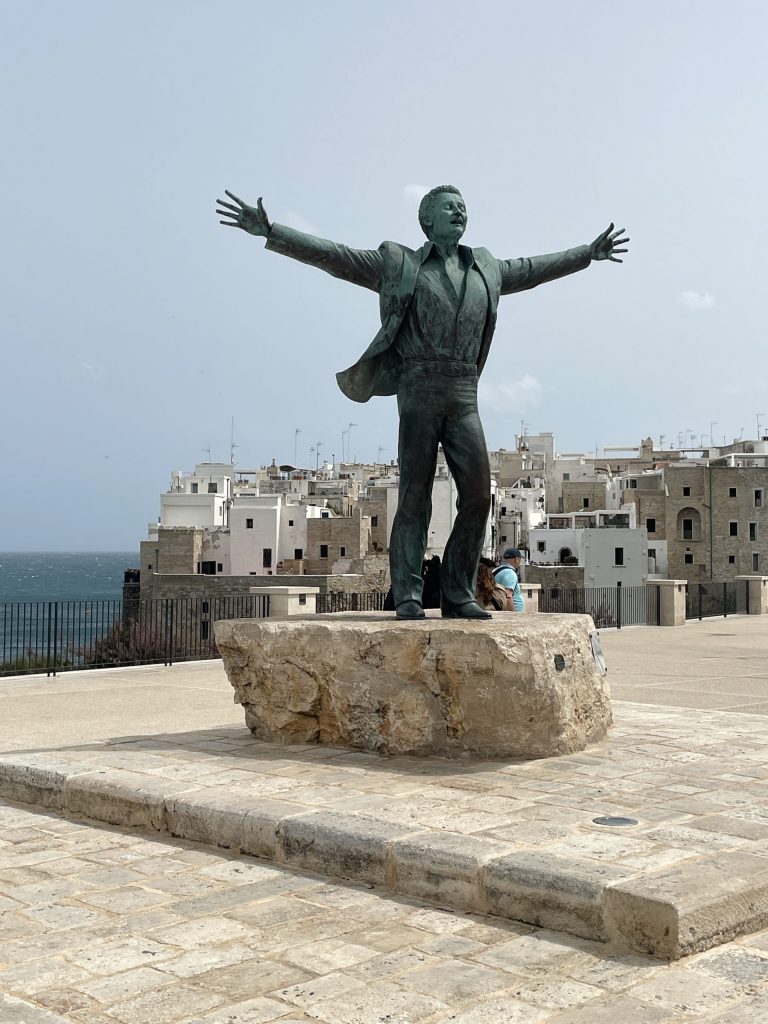 Polignano erinnert auch an Domenico Modugno, dessen Denkmal über der Bucht steht. Von hier stammt der Mann, der mit Volare Italiens berühmtestes Lied in die Welt trug.