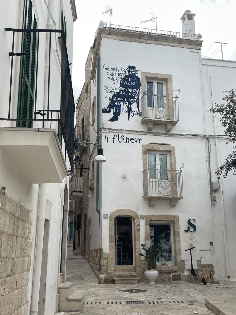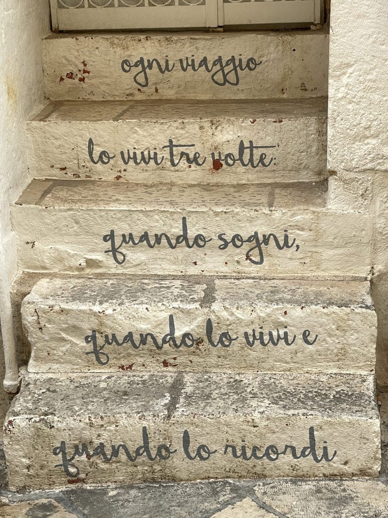 In der Altstadt gibt es sehr viele Treppen. Einige sind mit Gedicht-Graffitis geschmückt: der Autor ist ein Mann, der sich „Guido il Flâneur“ nennt und seit dreißig Jahren die Gassen Polignanos mit Versen und Aphorismen beschriftet. Einer drückt das Gefühl aus, das auch ich beim Flanieren durch die Gassen bekomme: Questo luogo è stato creato prima del Paradiso. Dieser Ort wurde vor dem Paradies geschaffen.