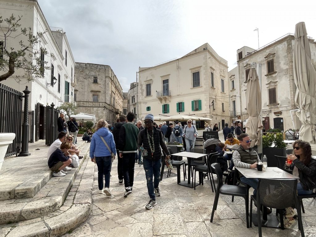 Aber auch das Grau bildet einen reizvollen Gegensatz zu den überwiegend weiß gestrichenen Häusern in einer gepflegten Altstadt. Es ist mir unerklärlich, warum solche Erhaltungsmaßnahmen nicht auch zum Beispiel in Catania, Acireale oder Acitrezza möglich sein sollten. Denn auch aus Apulien sind Menschen in den Norden oder ins Ausland abgewandert. Auch hier stehen die Häuser eng beieinander in verwinkelten Gassen.