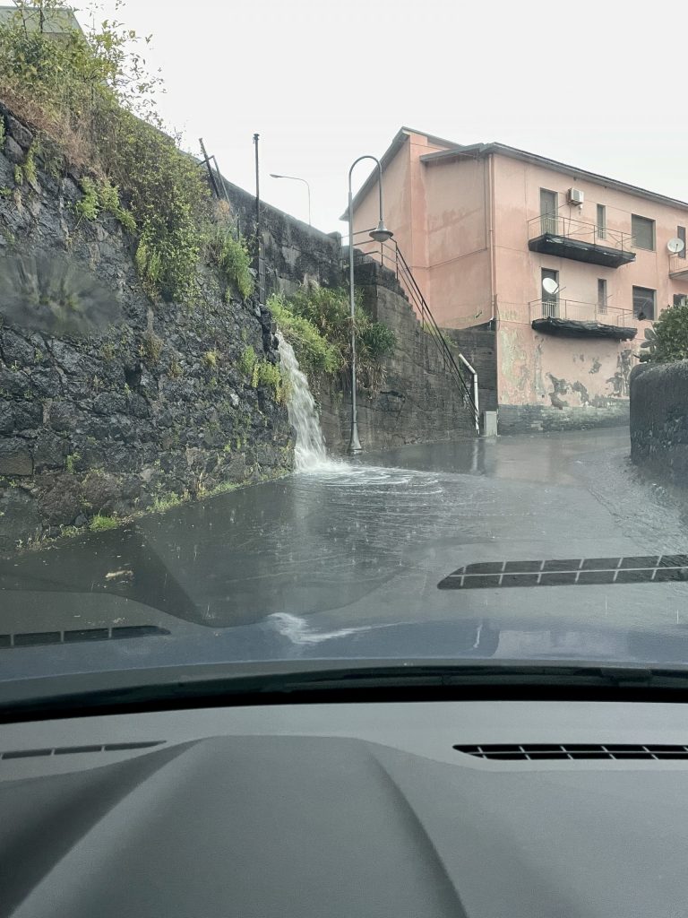Die Straße ist zu beiden Seiten von Steinmauern eingefasst, sodass das Wasser nur hangabwärts über den Asphalt abfließen konnte. Als ich am frühen Nachmittag zu Erika fuhr, hatten sich die Serpentinen bereits in einen reißenden Bach verwandelt. Mit dem einsetzenden Hagelschauer suchte ich Zuflucht in einem Café – auch, um das dortige WLAN zu nutzen.