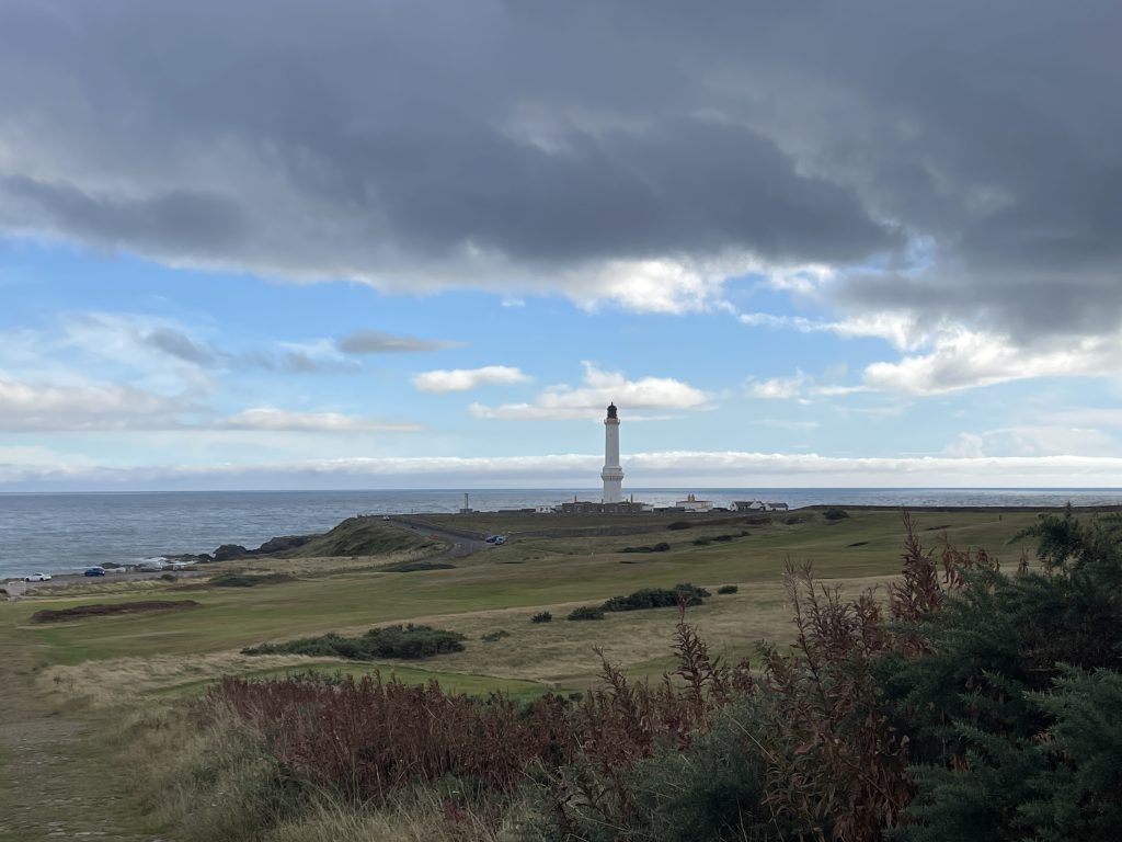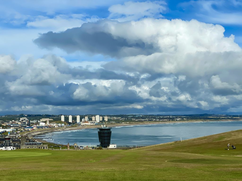 Penny wohnt in Torry, einem Stadtteil am südlichen Ufer des Flusses Dee, der zugleich die Zufahrt zum Hafen von Aberdeen bildet. Unser Spaziergang führt uns zur Greyhope Bay – einem beliebten Ort zur Delfinbeobachtung. Flipper & Co. lassen sich heute allerdings nicht blicken. Montagmittag spielen zum Glück ohnehin nur wenige Golf. Beim Überqueren des Golfplatzes fallen uns ein paar Regentropfen auf den Kopf, aber glücklicherweise keine Golfbälle.