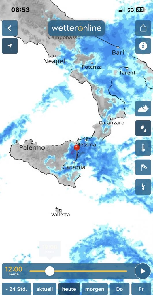 Gegen Mittag holte ich Erika in Acitrezza ab und fuhr sie zu einem Arzttermin. Sie fährt aufgrund ihres Alters – sie ist 90 Jahre – nur noch die notwendigsten Strecken selbst, und so freute sie sich, als ich einen kleinen Abstecher zum Eiscaffè in Stazzo vorschlug.
