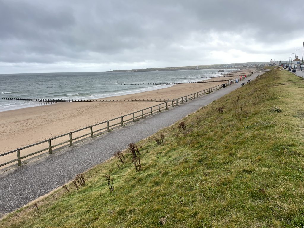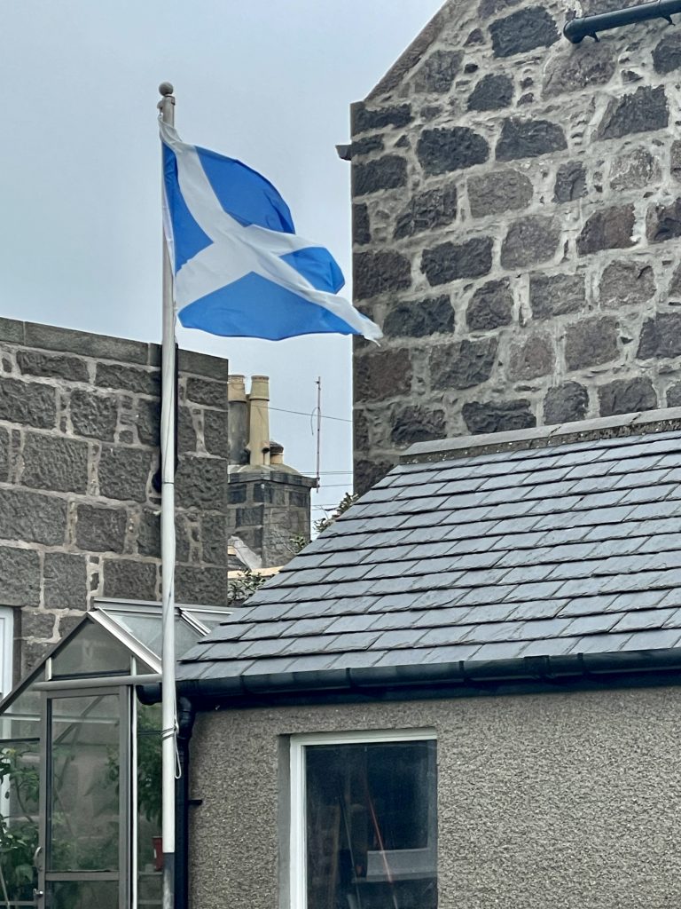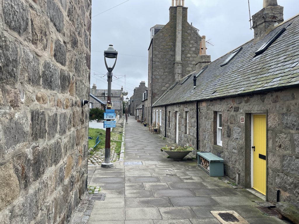 Am Hafeneingang, gegenüber von Torrie, liegt die kleine Siedlung Fittie. Beim Anblick der winzigen Häuser mit direktem Meerblick und dem ewigen Wellenrauschen vor der Tür kommt unwillkürlich die Fantasie ins Laufen, dort zu wohnen. Wie schon zuvor fallen mir auch hier die vielen gehissten Nationalflaggen auf – das weiße Andreaskreuz auf blauem Grund, die „Saltire“. Das ist nicht nur Ausdruck von Nationalstolz, sondern leider auch von zunehmendem Nationalismus.