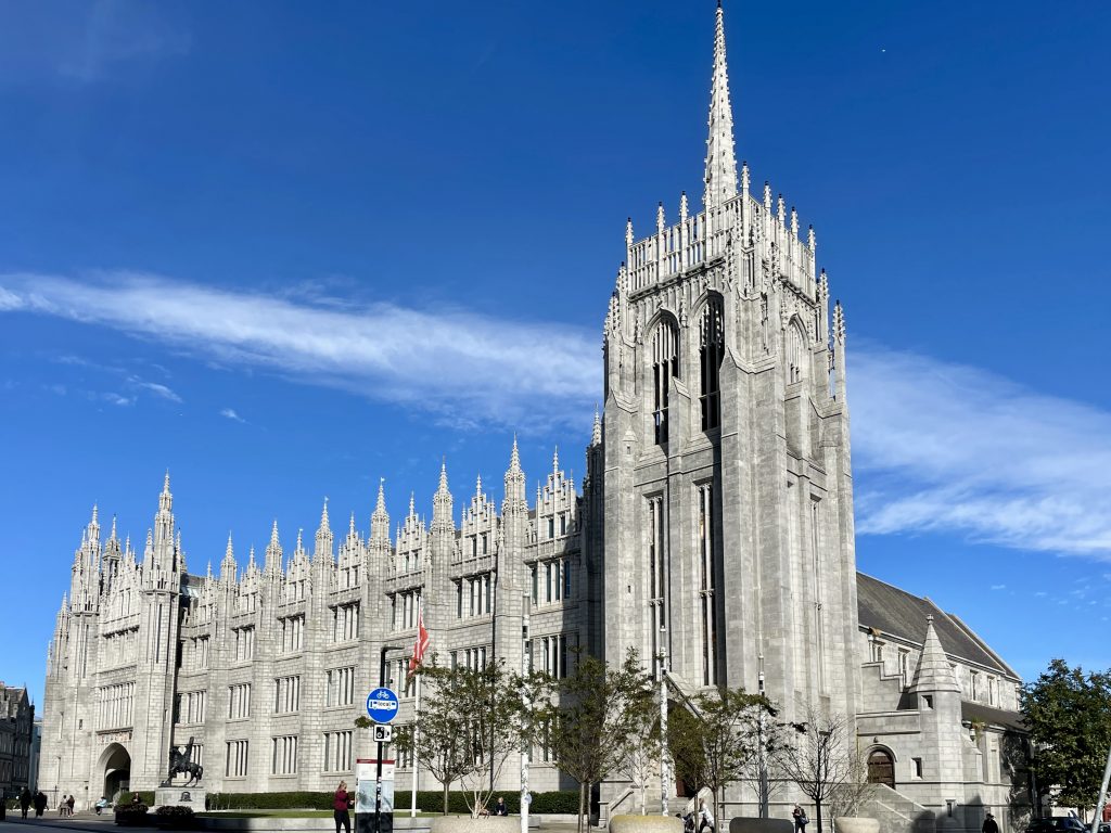 Hier das Das Marischal College (/ˈmɑːrʃl/ MAR-schəl) war zwischen 1593 und 1860 eine von zwei Universitäten in Aberdeen – neben dem King’s College. Im Jahr 1860 wurden beide Einrichtungen zusammengelegt und bilden seither die University of Aberdeen.