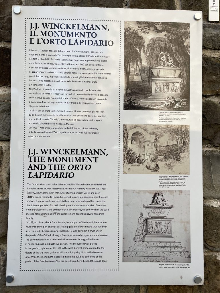 Am Eingang des Orto Lapidario hängt eine Tafel, die Winckelmanns Leben auf zwei Sprachen erzählt – und auf beiden dasselbe verschweigt. Dass er Männer liebte, dass seine Schwärmerei für den männlichen Körper keine rein ästhetische Abstraktion war, dass seine Briefe in dieser Hinsicht für die Epoche erstaunlich offen waren – davon kein Wort. Stattdessen: der Gelehrte, der Methodiker, das Opfer eines Raubes. Dabei ist gerade Triest der Ort, wo diese Auslassung besonders auffällt. Die Umstände seines Todes – die kurze, rätselhafte Freundschaft mit dem vorbestraften Arcangeli im Gasthaus – sind ohne den Hinweis auf seine Homosexualität schlicht unvollständig erzählt. Das ist keine Nachlässigkeit. Das ist eine Entscheidung. Und sie hat einen Namen: heterosexuelle Normativität.