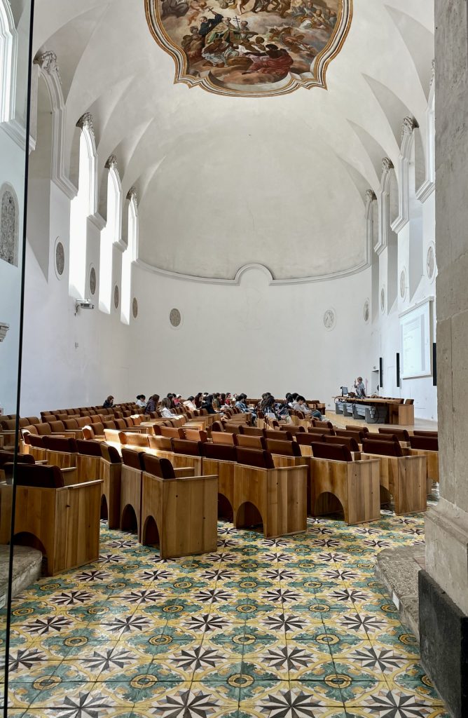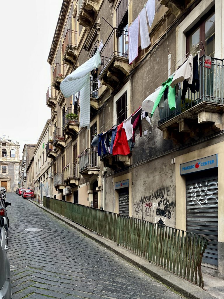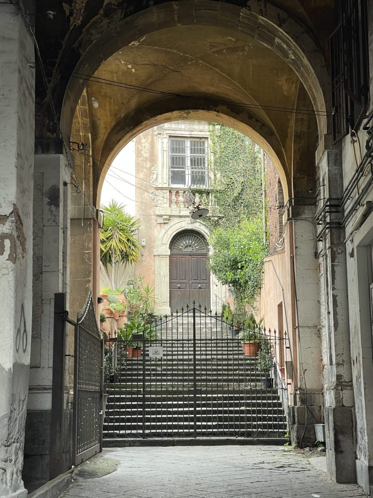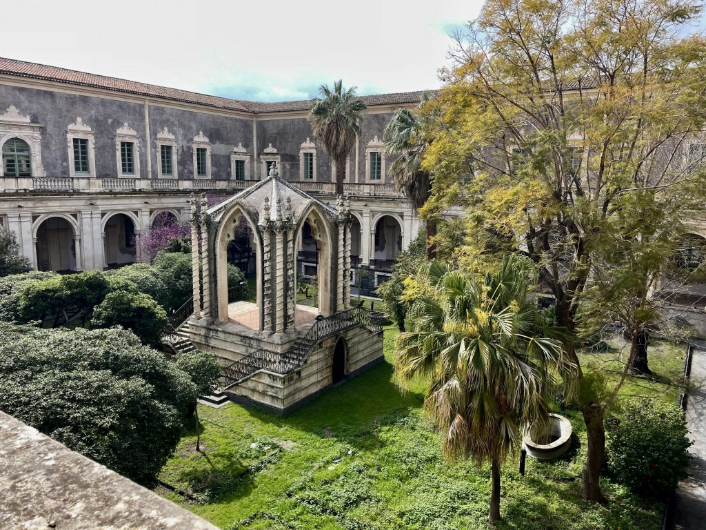 Erika zeigte mir heute ihren alten Arbeitsplatz, die Universität Catania. Jahrelang hat sie hier Deutsch unterrichtet, in einem Palazzo aus dem 18. Jahrhundert, der einmal nach einem Erdbeben aus dem Lavagestein des Ätna neu errichtet wurde. Während wir durch die Höfe und langen Gänge gingen, erzählte sie von ihrer Arbeit als Lektorin an dieser sehr alten Universität.