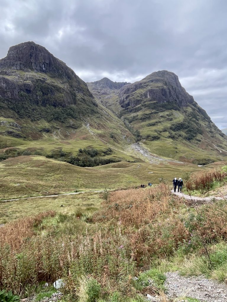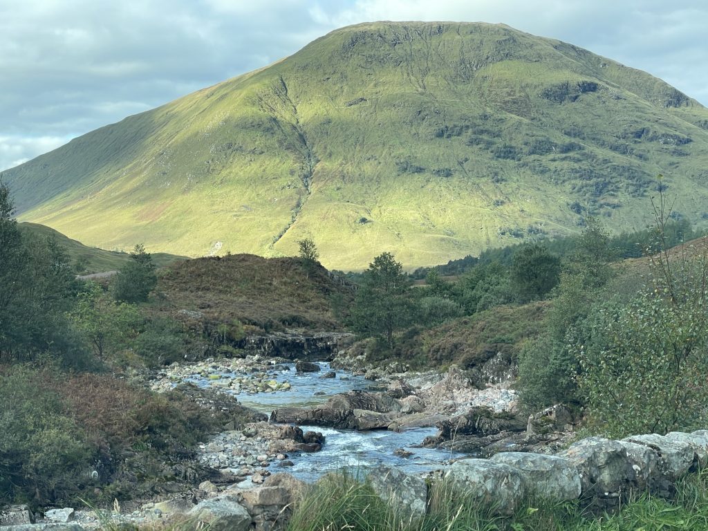 Mit meinem kleinen Fiat fand ich zum Glück leicht einen Parkplatz am überfüllten Three Sisters Viewpoint. Unfair war allerdings, dass manche Camper verbotenerweise dort schon seit gestern Abend standen. Die Three Sisters ragten bis zu 1.150 Meter in die Höhe – ein Anblick, der Worte hervorrief, die ich selten benutze: majestätisch, grandios, überwältigend. Ich begnügte mich nicht mit einem Fotostopp, sondern wanderte von der Sonne verwöhnt hinunter zum Fluss. Auch beim Anblick von Schottlands berühmtestem pyramidenförmigem Berg, dem Buachaille Etive Mòr, fühlte ich mich so klein wie ein Hobbit.