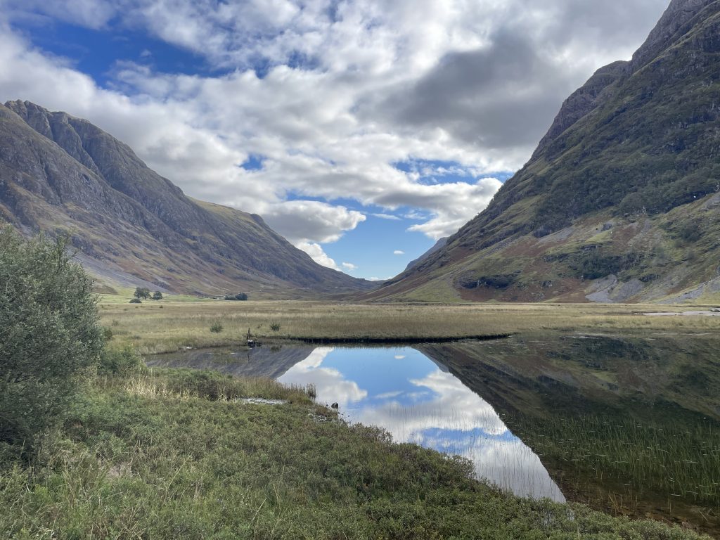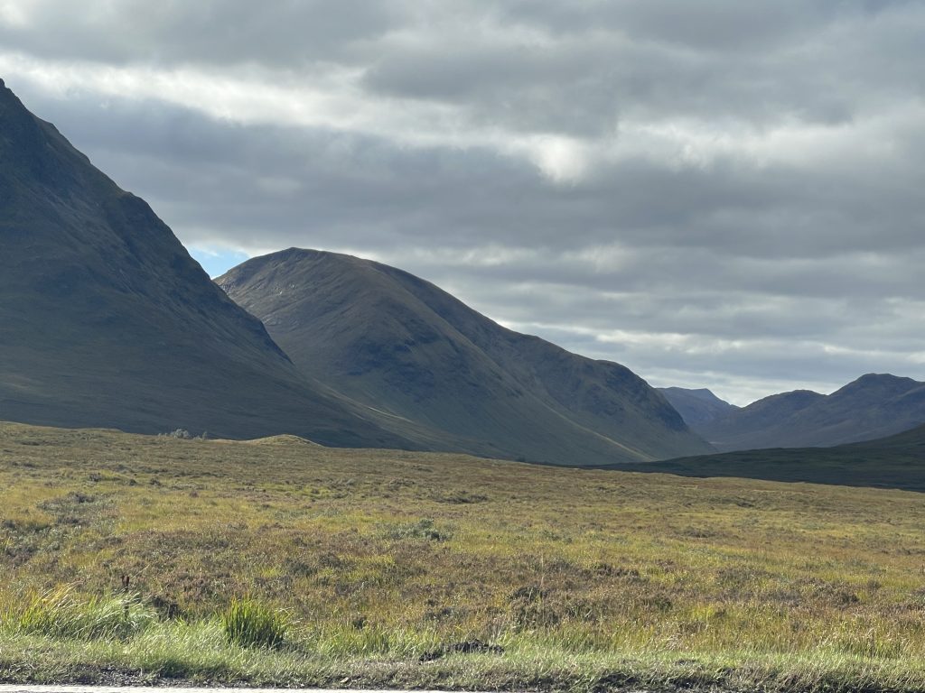 Glencoe empfing mich mit einer Schönheit, die zugleich wild und melancholisch wirkte. Im Visitor Centre erfuhr ich, dass dieses Tal einst Teil eines kollabierten Vulkans war – vor über 400 Millionen Jahren. Die „Three Sisters“ und die schroffen Grate des Aonach Eagach sind steinerne Zeugen dieser Urgewalt. Später modellierten Gletscher die Berge und Täler zu jener klassischen U-Form, die heute Wanderer und offenbar auch Geologen begeistert. Der River Coe schlängelte sich durch die Landschaft, stürzte über Wasserfälle und mündete in das stille Loch Leven. Auf dem Weg dorthin versorgte das Hochmoor die Landschaft mit Wasser.