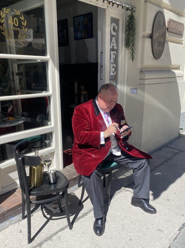 Auf dem Weg zu einem der ältesten Kaffeehäuser Wiens ging ich an einer kleinen Café-Weinbar vorbei. Die Szene dort traf mein Bild von Wien so genau, dass ich umkehrte und den Herrn fragte, ob ich ihn fotografieren dürfe. Die Sonne und die Zigarre genießend, dazu ein Glas Champagner, saß er vor seinem Geschäft. Er erzählte, dass er für das JDC gearbeitet habe, genau wie Dr. Lippmann 1940. Er hatte sich seinerzeit um die jüdischen Ausreisenden aus dem Osten, also aus Russland und Polen, gekümmert. Das Gespräch und die Begegnung waren der besondere Gewinn des Tages.