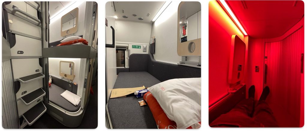 Als ehemaliger Rotel-Reisender und Segler bin ich schmale Kojen gewohnt, und so war die Nacht dort deutlich angenehmer, als es der starre Sitz je hätte sein können. Ich schlief gut, eingehüllt in meinen Leinenschlafsack, mit einem winzigen „Kissenleinchen“ unter dem Kopf. Auch dieses Mal galt: Nicht immer hält das rote Licht, was es dem Wandersmann verspricht – zum Glück ließ sich das kleine Farbspiel ausschalten. Am Kopfende fand sich sogar eine kleine Durchreichtür zum Nachbarabteil, eine freundliche Konstruktion, die kurzen Kontakt ermöglicht, ohne die Privatsphäre aufzugeben.