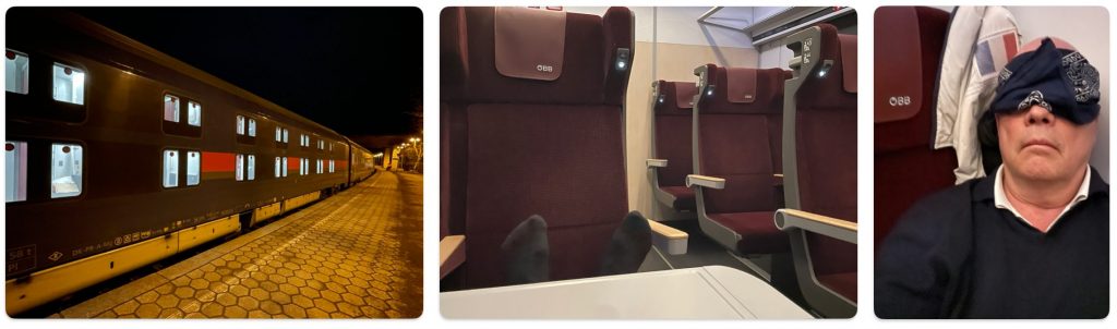 Der Zug rollte pünktlich aus dem Harburger Bahnhof, und ich saß auf meinem reservierten Platz in einem fast leeren Abteil. Das überraschte mich – laut Buchung sollte der Schlafwagen ausgebucht sein, und auch im Liegewagen gab es kaum noch freie Plätze. Die neuen ÖBB-Sitze sahen zwar schick aus, erwiesen sich aber als unbequem und nicht verstellbar. Beim Buchen hatte ich an die großzügigen Liegesessel auf Fähren gedacht, die sich weit zurücklehnen lassen – eine Illusion, wie sich nun zeigte.