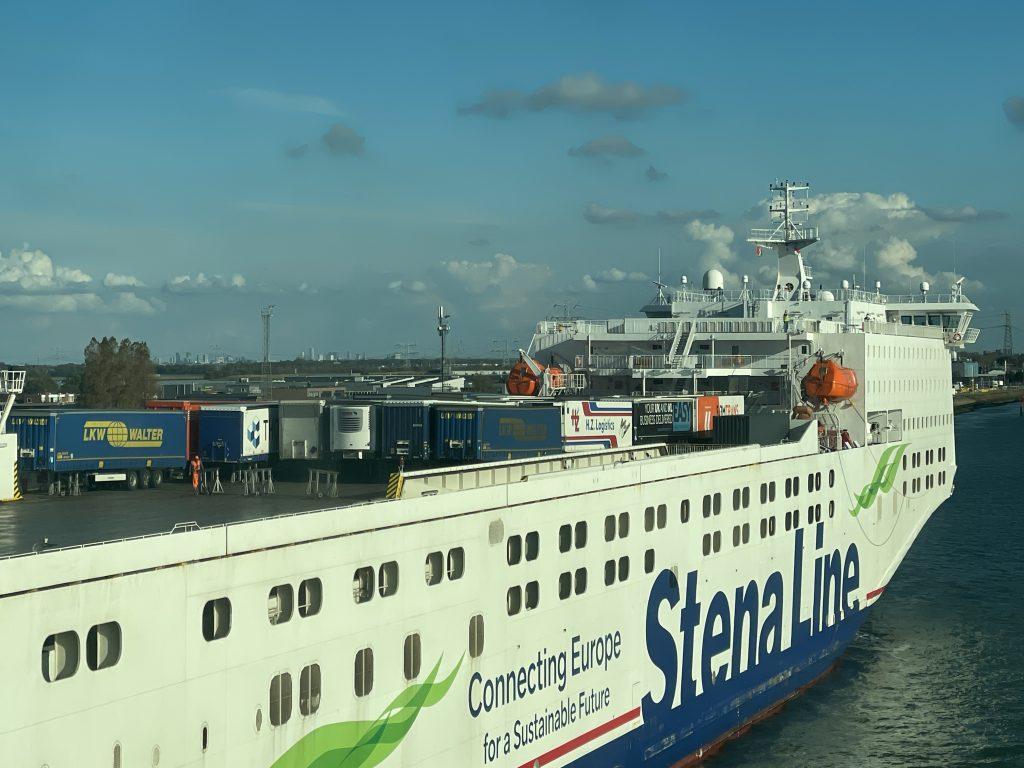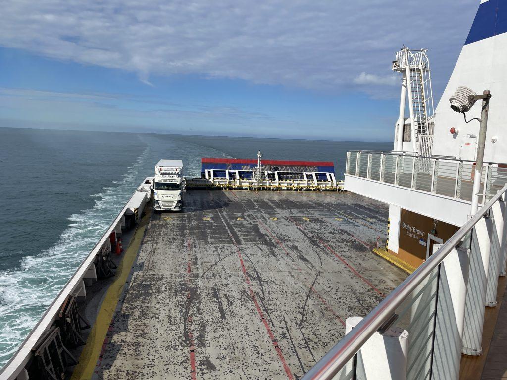 Auf der Rückfahrt von England zum Kontinent steht ein einzelner LKW auf der weiten Ladefläche der Fähre. Auf der Hinfahrt war das Deck voll – ein Sinnbild für Handel, Austausch, Bewegung. Jetzt: gähnende Leere.