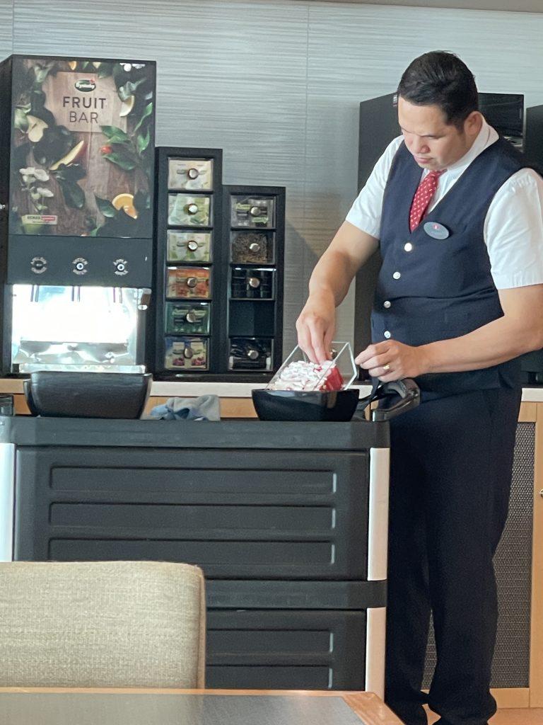 Es sind so wenige Passagiere an Bord, dass sich das Personal damit beschäftigt, die Salz-Tütchen sorgfältig auszurichten.